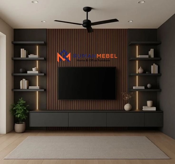 TV Backdrop: Panel kayu vertikal/akustik sebagai aksen dinding.