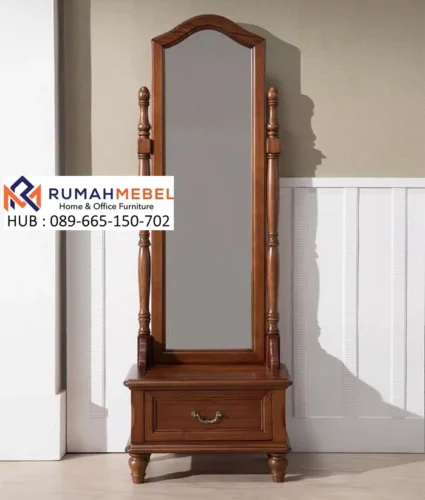 Desain klasik seperti ini selalu relevan, sehingga cocok dipadukan dengan gaya interior yang minimalis maupun tradisional. Selain berfungsi sebagai cermin seluruh badan, cermin ini juga berperan sebagai meja konsol kecil karena memiliki laci untuk penyimpanan.