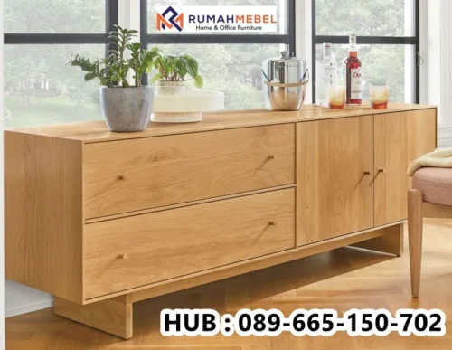 Desain kabinet ini menggabungkan gaya minimalis modern dengan fungsionalitas optimal melalui pintu kabinet rapat, rak penyimpanan luas, dan laci praktis yang memudahkan dalam menyimpan berbagai barang seperti buku, koleksi dekoratif, perangkat multimedia, atau kebutuhan rumah tangga lainnya secara rapi dan terorganisir. Finishing natural tidak hanya memperkuat keindahan warna kayu jati tetapi juga membuat permukaan lebih mudah dibersihkan serta tahan gores ringan.