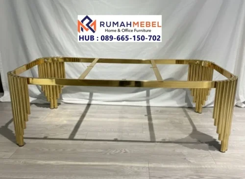 Terbuat dari stainless steel berkualitas tinggi yang kuat, tahan karat, dan awet. Menggunakan penataan pipa vertikal dengan panjang berbeda yang menciptakan efek visual geometris yang menarik. Warna emas yang memiliki efek mengkilap memberikan kesan glamor, elegan, dan sangat mewah. Dilengkapi oleh rangka atas yang tebal dan palang penguat di tengah, produk ini siap mendukung berbagai jenis permukaan meja, mulai dari marmer dan kaca tempered hingga kayu solid.