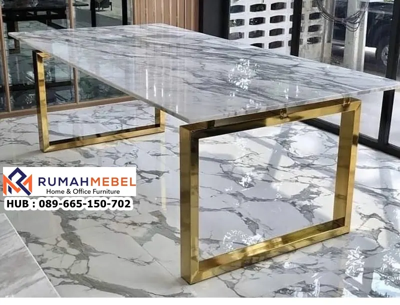Jika anda ingin menghadirkan suasana ruang makan mewah ke rumah. Meja marmer stainless gold Jawa Tengah ini bukan hanya sekadar benda, tetapi sebuah simbol gaya hidup. Kombinasi antara keindahan alami marmer dan kilauan stainless steel warna emas menciptakan tampilan yang tampak elegan dan modern.