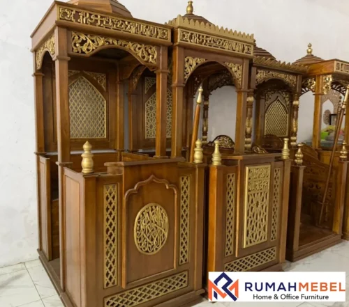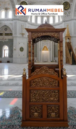 Tampilan desain nya yang berkelas dan menggunakan bahan kayu jati sebagai bahan utama dalam membuat mimbar masjid sebab Kayu jati memiliki pola serat lurus dengan garis-garis tegas yang membuat tampilannya makin elegan. Warna coklat keemasan atau coklat tua menjadikannya terlihat natural namun sangat berkelas.Kayu jati mampu bertahan di luar ruangan tanpa mudah retak atau lapuk inilah sebabnya jati banyak digunakan untuk furnitur.