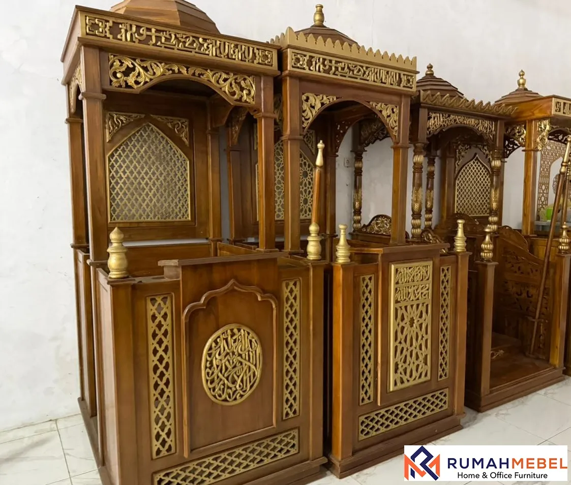 Tampilan desain nya yang berkelas dan menggunakan bahan kayu jati sebagai bahan utama dalam membuat mimbar masjid sebab Kayu jati memiliki pola serat lurus dengan garis-garis tegas yang membuat tampilannya makin elegan. Warna coklat keemasan atau coklat tua menjadikannya terlihat natural namun sangat berkelas.Kayu jati mampu bertahan di luar ruangan tanpa mudah retak atau lapuk inilah sebabnya jati banyak digunakan untuk furnitur.