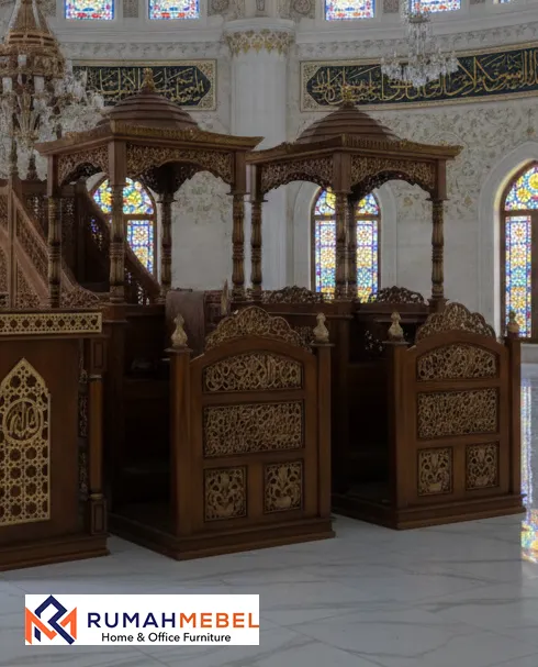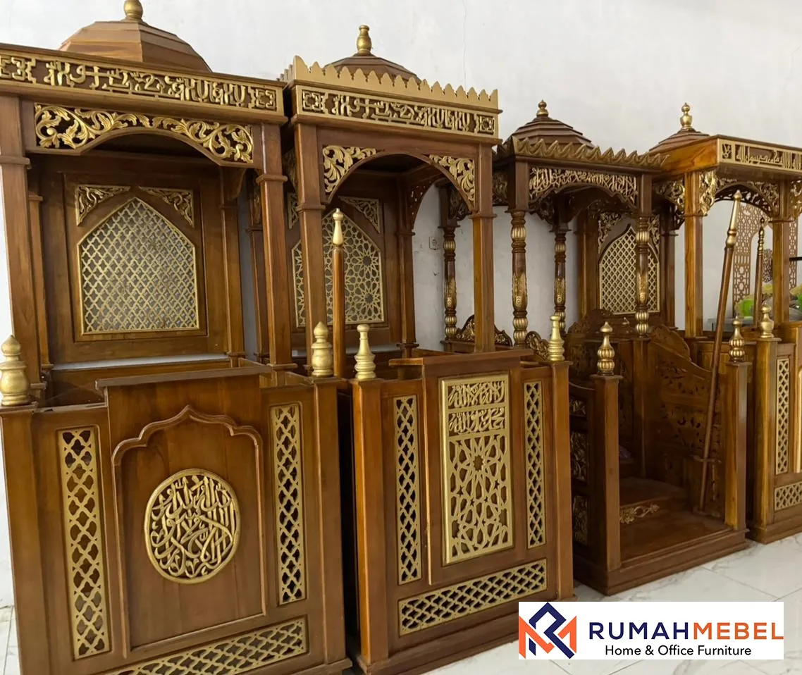 Tampilan desain nya yang berkelas dan menggunakan bahan kayu jati sebagai bahan utama dalam membuat mimbar masjid sebab Kayu jati memiliki pola serat lurus dengan garis-garis tegas yang membuat tampilannya makin elegan. Warna coklat keemasan atau coklat tua menjadikannya terlihat natural namun sangat berkelas.Kayu jati mampu bertahan di luar ruangan tanpa mudah retak atau lapuk inilah sebabnya jati banyak digunakan untuk furnitur.