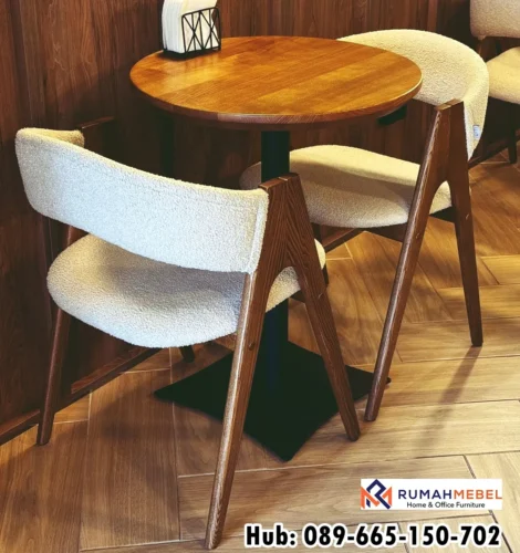 Dibuat menggunakan material kayu pilihan berkualitas tinggi yang telah melalui proses pengeringan dan finishing secara profesional. Hal ini membuat kursi memiliki konstruksi yang kokoh, stabil, serta tahan digunakan dalam jangka waktu yang lama. Desain kursinya dibuat ergonomis agar memberikan kenyamanan maksimal bagi pengunjung cafe ketika duduk menikmati makanan ataupun minuman. Selain itu, permukaan kayu yang halus dan finishing yang rapi juga menambah nilai estetika sehingga kursi terlihat lebih mewah dan berkelas.