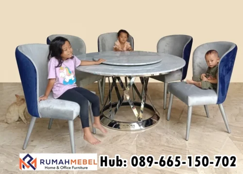 Top meja yang menggunakan material marmer dikenal memiliki tampilan alami dengan motif yang unik pada setiap lembarannya. Hal ini membuat setiap meja makan marmer memiliki karakter berbeda sehingga terlihat lebih eksklusif. Selain itu, marmer juga memiliki permukaan yang kuat, tahan panas, dan mudah dibersihkan sehingga sangat cocok digunakan sebagai meja makan sehari-hari. Sementara itu, kaki meja yang terbuat dari bahan stainless steel memberikan kekuatan dan kestabilan yang sangat baik. Material stainless juga terkenal tahan karat, awet, serta memiliki tampilan mengkilap yang menambah kesan modern pada meja makan.