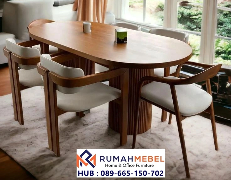 Desain oval tanpa sudut tajam menciptakan rasa luas dan aman bagi anggota keluarga. Kaki meja berbentuk pilar memberikan stabilitas yang maksimal sekaligus menjadi elemen desain yang menarik. Terbuat dari Kayu Jati Solid berkualitas tinggi (Grade A) dengan finishing alami yang menonjolkan serat kayu yang autentik. Desain kursi ini memiliki sandaran melengkung yang menyatu dengan lengan kursi, menawarkan tambahan kenyamanan. Dudukan kursi terbuat dari busa berkepadatan tinggi yang dilapisi dengan kulit sintetis (oscar) atau kain premium berwarna putih gading (broken white).