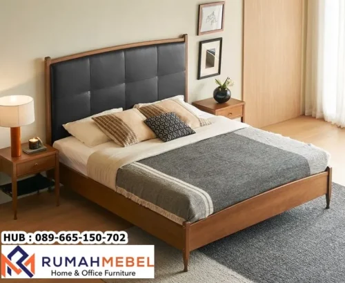 Dibangun dari kayu jati solid yang berkualitas unggul, material ini terkenal karena ketahanannya, daya tahan yang lama, dan keamanannya terhadap serangan rayap. Struktur serat kayunya memberikan suasana hangat yang langsung terasa di dalam ruangan. Didesain dengan kaki-kaki yang ramping tetapi kuat, ini menciptakan ilusi luas pada ruang dan mempermudah dalam membersihkan bagian bawah tempat tidur. Dilengkapi dengan headboard kulit hitam yang memiliki jahitan aksen kotak-kotak, memberikan nuansa maskulin, mewah, dan sangat nyaman untuk bersandar saat membaca buku atau menikmati TV.