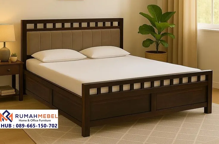 Bahan yang digunakan adalah kayu jati pilihan, yang terkenal kuat, awet, serta memiliki serat alami yang cantik. Desain kotak-kotak di bagian atas kepala dan kaki ranjang menambah karakter modern yang menarik dan tidak membosankan. Ranjang ini dilengkapi dengan panel empuk berwarna cokelat muda yang memberikan kenyamanan tambahan ketika Anda bersandar untuk membaca atau menonton televisi.
