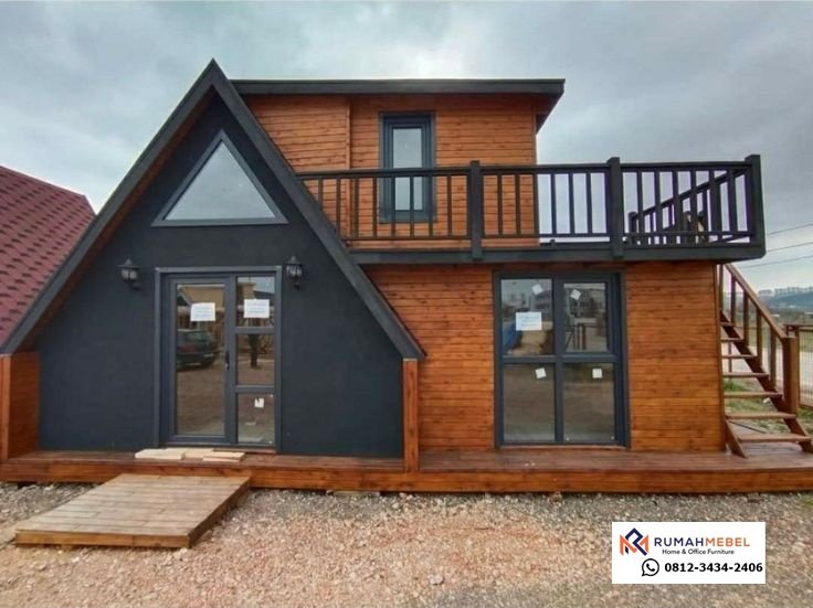 Kabin Modular A-Frame Kayu 2 Lantai – Desain Kontemporer Two-Tone dengan Teras Balkon Atas