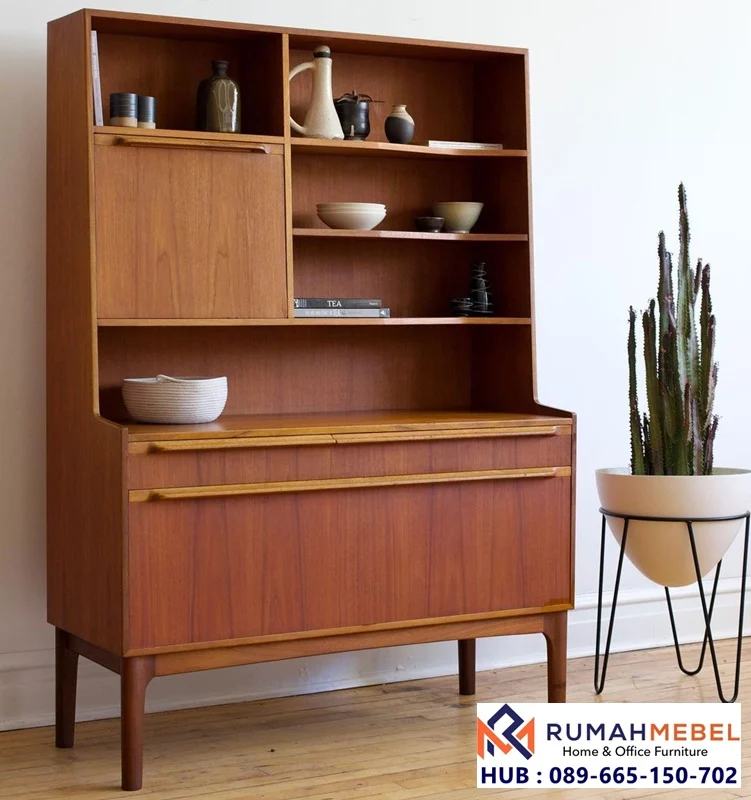 Furnitur ini dapat berfungsi sebagai sideboard, rak buku, hutch, atau meja kerja mini. Desain yang terinspirasi dari gaya Mid-Century Modern menciptakan suasana yang hangat dan elegan di rumah Anda.