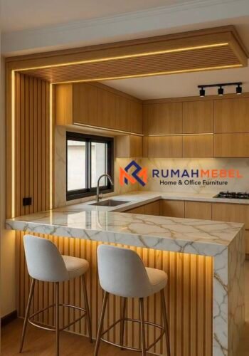 Kami menawarkan jasa pembuatan Kitchen Set Custom yang menonjolkan gaya Modern Minimalis dengan sentuhan hangat. Desain ini secara harmonis memadukan kabinet kayu yang fungsional, panel kayu vertikal sebagai aksen, dan countertop marmer mewah pada kitchen island (mini bar) yang elegan. Dilengkapi dengan pencahayaan LED strip tersembunyi yang menciptakan suasana dramatis dan nyaman, dapur ini tidak hanya optimal untuk memasak tetapi juga sempurna untuk kegiatan berkumpul. Wujudkan ruang dapur yang fungsional dan berkelas bersama RUMAHMEBEL.