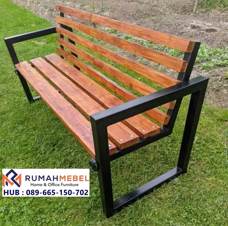 Kursi taman ini menerapkan konsep minimalis Industrial yang menonjolkan garis-garis yang jelas dan tegas. Rangka kursi terbuat dari besi kotak (hollow) berkualitas tinggi yang dilapisi dengan cat hitam matte yang tahan karat. Sementara itu, bagian duduk dan sandaran terbuat dari kayu solid yang memiliki finishing natural gloss, menampilkan serat asli kayu dan menciptakan kontras hangat dengan rangka besi yang dingin.