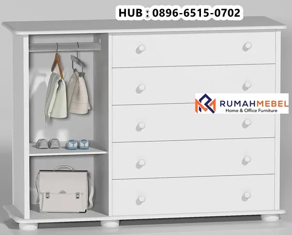 Lemari bayi duco putih minimalis dirancang dengan susunan penyimpanan yang fungsional, terdiri dari rak, pintu, dan laci untuk memudahkan menyimpan pakaian bayi, selimut, popok, handuk, maupun perlengkapan harian lainnya