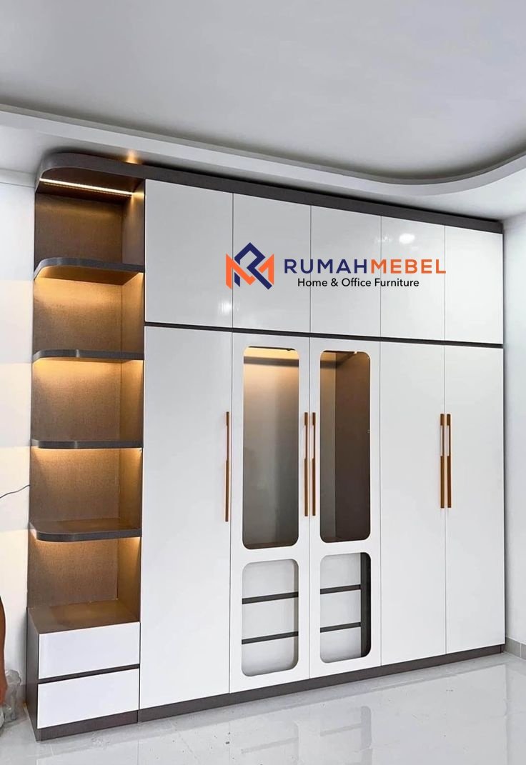 Lemari Pakaian Custom 6 Pintu Mewah! Desain minimalis putih glossy dengan rak display LED melengkung yang super estetik. Solusi penyimpanan full-ceiling yang bikin kamar Anda serasa butik. Pesan custom sesuai ukuran kamar Anda!