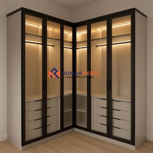 Maksimalkan ruang sudut kamar Anda dengan Walk-in Closet Modern yang mewah ini, menampilkan desain minimalis dengan pintu kaca transparan berbingkai hitam elegan. Dilengkapi dengan laci penyimpanan tertutup dan pencahayaan LED internal yang hangat, lemari ini tidak hanya berfungsi sebagai tempat penyimpanan yang efisien tetapi juga sebagai elemen dekoratif yang menawan, mengubah ruang pakaian Anda menjadi butik pribadi yang stylish.