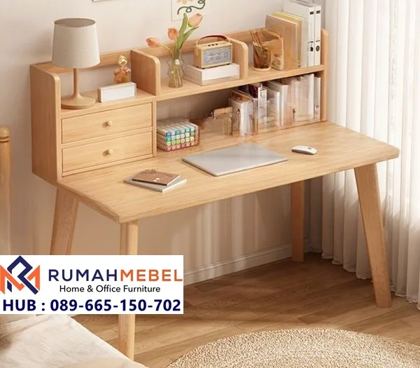 Mengoptimalkan penggunaan ruang vertikal untuk menata buku, ornamen, atau koleksi alat tulis agar meja tetap teratur. Dilengkapi dengan 2 laci kecil untuk menyimpan barang-barang penting (perhiasan, alat tulis, atau kabel) agar tidak berserakan. Permukaan meja yang luas cukup untuk menampung laptop, buku catatan, hingga lampu meja secara bersamaan. Sangat pas sebagai meja belajar untuk anak, meja kerja WFH, atau meja untuk merias.