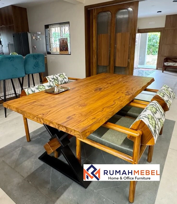 Meja dengan bahan kayu menjadi produk unggulan yang ada di toko kami sebab kami memilih dan memilah sendiri jenis kayu jati yang akan kami gunakan untuk membuat furniture berkualitas tinggi agar customer kami semakin puas dengan pelayanan yang ada di toko kami. Setiap detail dikerjakan dengan presisi tinggi oleh pengrajin berpengalaman untuk menjaga nilai estetika dan fungsionalitasnya. Kombinasi bahan alami dan logam memberikan karakter kuat yang menonjol di ruang makan. Konstruksinya kokoh, membuat meja ini sangat stabil dan tidak mudah bergoyang. Finishing natural pada kayu jati mempertahankan warna khasnya yang hangat dan menenangkan. Produk Meja Kayu Jati ini cocok digunakan untuk ruang makan keluarga, restoran, kafe, atau bahkan ruang kerja bernuansa rustic.