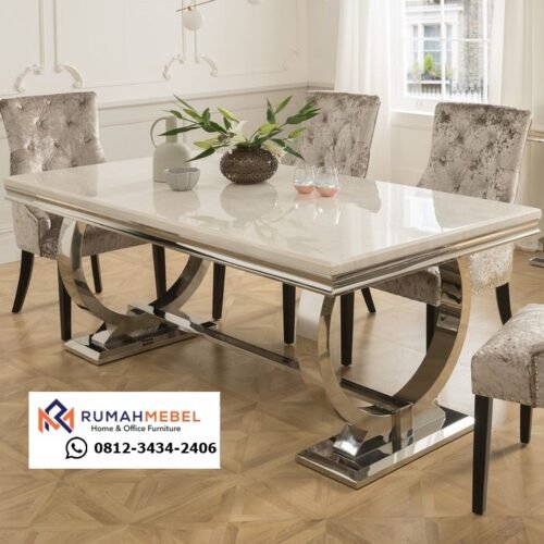 Meja Makan Mewah Kaki Stainless & Top Marmer – Desain Modern Elegan