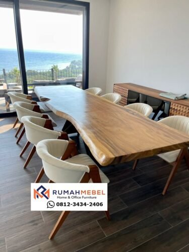 Meja Rapat Trambesi Mewah Kayu Jati merupakan pilihan terbaik untuk melengkapi ruangan anda. meja rapat berukuran besar yang dibuat dari kayu trembesi (suar) solid utuh, dengan desain unik yang menonjolkan kealamian serat kayu. Meja ini cocok untuk ruang rapat kantor karena kemampuannya menampung banyak orang dan memberikan kesan elegan dan asri. Keunggulannya pada meja rapat adalah tampilannya yang mewah, kokoh, awet, dan dibuat oleh pengrajin Jepara yang terampil. Secara keseluruhan, meja rapat Trembesi mewah dari Jepara adalah perpaduan harmonis antara keindahan alam dan keahlian manusia, menciptakan sebuah furnitur yang fungsional, artistik, dan berkarakter.