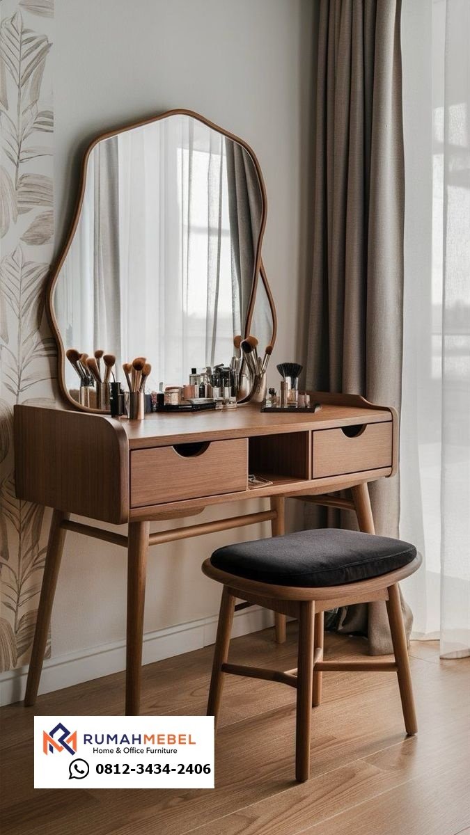 Desainnya yang minimalis dengan sentuhan modern menghadirkan nuansa mewah tanpa berlebihan. Cermin berbentuk unik memberikan karakter tersendiri, membuat aktivitas berdandan terasa lebih menyenangkan setiap hari.