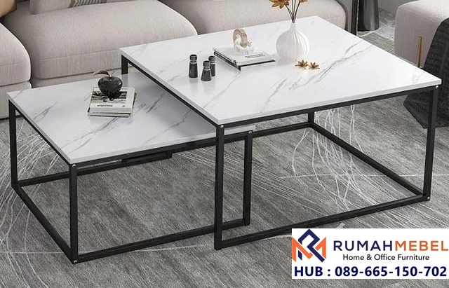 Set ini terdiri dari dua meja dengan tinggi yang berbeda, di mana meja yang lebih kecil bisa disimpan di bawah meja yang lebih besar untuk mengoptimalkan ruang saat tidak digunakan. Permukaan meja berwarna putih dengan garis abu-abu yang elegan (tampak seperti marmer) memberikan nuansa bersih, luas, dan mewah. Menggunakan struktur besi hollow berwarna hitam yang minimalis, kokoh, dan memberikan nuansa industrial yang kuat.