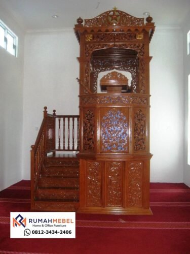 Mimbar kayu jati ukiran jepara merupakan produk yang biasa dipesan untuk melengkapi furniture pada masjid-masjid. Desain mimbar ini memiliki bentuk kubah pada bagin atap mimbar yang memberikan kesan elegan dan kokoh, serta pintu samping yang memudahkan akses bagi penceramah dalam menyampaikan khuttbah pada jemaah yang hadir.