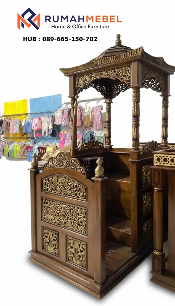 Seperti yang kita ketahui bahwasanya mimbar masjid merupakan perabotan penting yang ada di dalam masjid dengan fungsi sebagai tempat imam untuk berdiri saat menyampaikan pesan kepada jamaah. biasanya Mimbar masjid dilengkapi dengan platform atau podium yang lebih tinggi untuk membantu suara imam terdengar lebih jelas oleh seluruh jamaah yang hadir di masjid. Terbuat dari kayu jati yang sudah diakui sebagai material kayu terbaik di dunia untuk industri furnitur dan interior, terutama karena reputasinya yang luar biasa dalam hal kekuatan, keawetan, dan estetika.