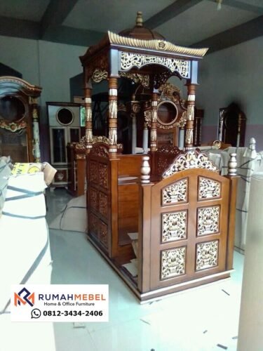 Mimbar Masjid Ukiran Jepara adalah produk furnitur yang dirancang khusus untuk digunakan di masjid, terbuat dari kayu jati berkualitas tinggi yang terkenal akan kekuatan dan daya tahannya. Produk ini diproduksi oleh pengrajin Jepara, yang memiliki reputasi dalam menghasilkan furnitur kayu dengan ukiran halus dan detail yang indah, Membawa keharuman spiritual dan keanggunan seni ke dalam masjid Anda.