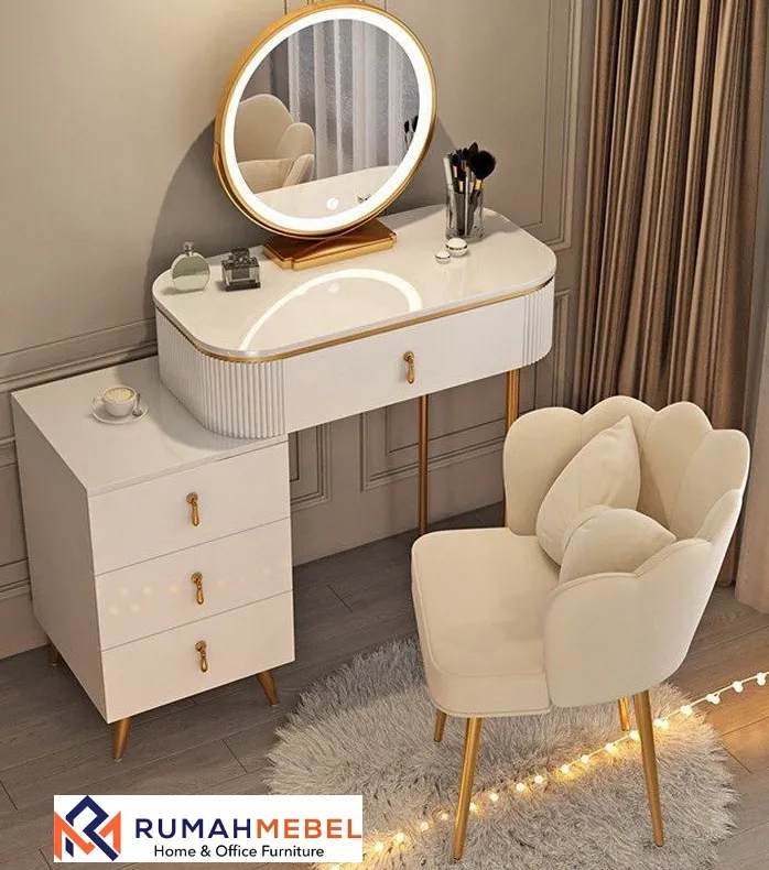 Material pilihan memastikan daya tahan dan kekuatan meja dalam jangka panjang. Kombinasi antara desain yang estetis dan sistem penyimpanan yang efisien menjadikan meja rias ini solusi tepat untuk menjaga kerapian ruang pribadi Anda.