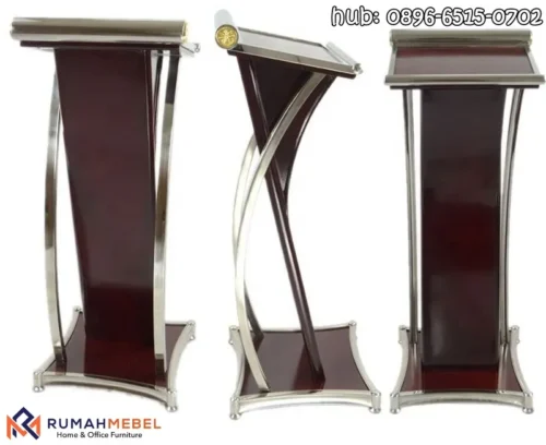 Podium stainless merupakan mimbar modern yang terbuat dari baja antikarat, memiliki tampilan elegan serta daya tahan tinggi sehingga cocok digunakan dalam berbagai acara resmi apalagi dipadukan dengan kayu jati yang menambahkan kesan elegant dan minimalis.