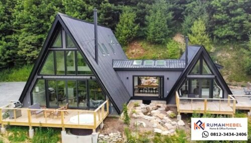 - Struktur Ganda: Dua kabin A-Frame berfungsi sebagai sayap, memberikan pemisahan fungsional (misalnya, satu sisi untuk ruang tamu/hiburan dan sisi lain untuk kamar tidur utama).