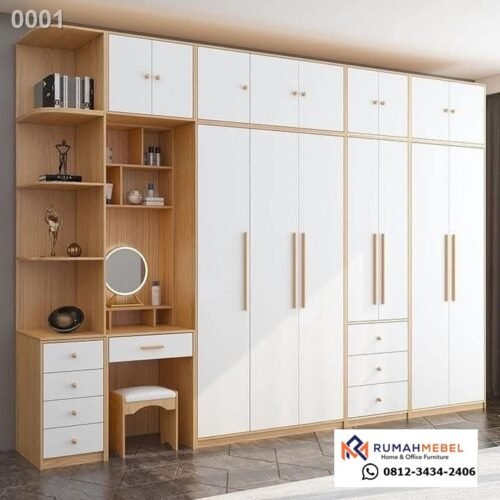 Set Lemari Pakaian Minimalis Modern Full Height yang mengintegrasikan area penyimpanan maksimal, laci, rak display terbuka, dan Meja Rias (dressing table) yang praktis. Hadirkan nuansa bersih dan terorganisir dengan perpaduan warna putih dan aksen kayu.