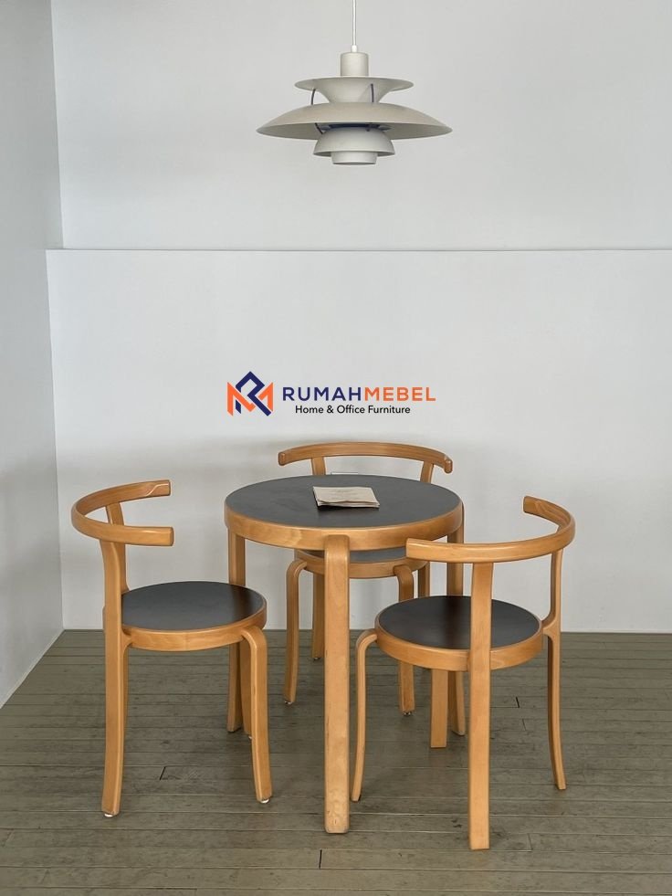 Set Kursi & Meja Kafe Skandinavia – Set 3 kursi dan 1 meja bundar yang super estetik. Desain minimalis kayu solid dengan jok/dudukan gelap yang nyaman. Cocok untuk cozy corner di rumah atau kafe Anda. Dapatkan suasana ala Nordik sekarang!