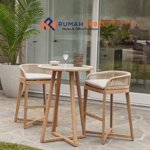 Meja bar bundar memiliki top table dengan finishing berwarna abu-abu muda yang kontras, melengkapi rangka kayu jati alami. Kaki meja yang dirancang dengan struktur silang (X-base) menjamin stabilitas yang sangat baik dan menambah detail desain yang modern. Kami di RUMAHMEBEL memproduksi set ini dengan standar kualitas ekspor dan siap melayani pemesanan kustomisasi material atau finishing sesuai dengan kebutuhan proyek Anda. Set Meja Bar ini berfungsi sebagai focal point yang menarik dan meningkatkan kualitas ruang outdoor Anda.