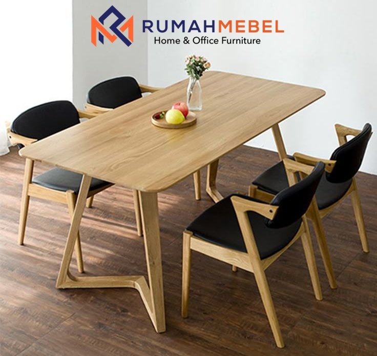 Set Meja Makan Kayu Minimalis Skandinavia dari RUMAH MEBEL menawarkan kombinasi sempurna antara fungsi dan estetika modern, terdiri dari meja kayu solid dengan permukaan halus dan empat kursi dengan desain ergonomis. Bingkai kayu berwarna cerah yang memancarkan kehangatan alami berpadu kontras dengan jok hitam, menciptakan tampilan yang ramping dan elegan yang sangat cocok untuk mempercantik ruang makan berkonsep minimalis, menjadikannya tempat yang nyaman dan stylish untuk setiap momen bersantap.
