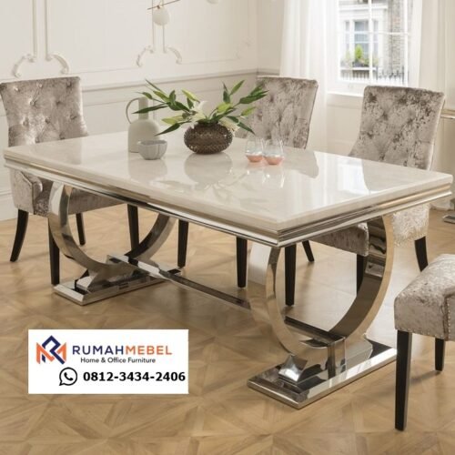 Jangan biarkan ruang makan Anda biasa saja! Segera hubungi RUMAH MEBEL di 0812-3434-2406 dan pesan Set Meja Makan Marmer Kaki Stainless yang ikonik ini untuk menciptakan statement kemewahan di rumah Anda!