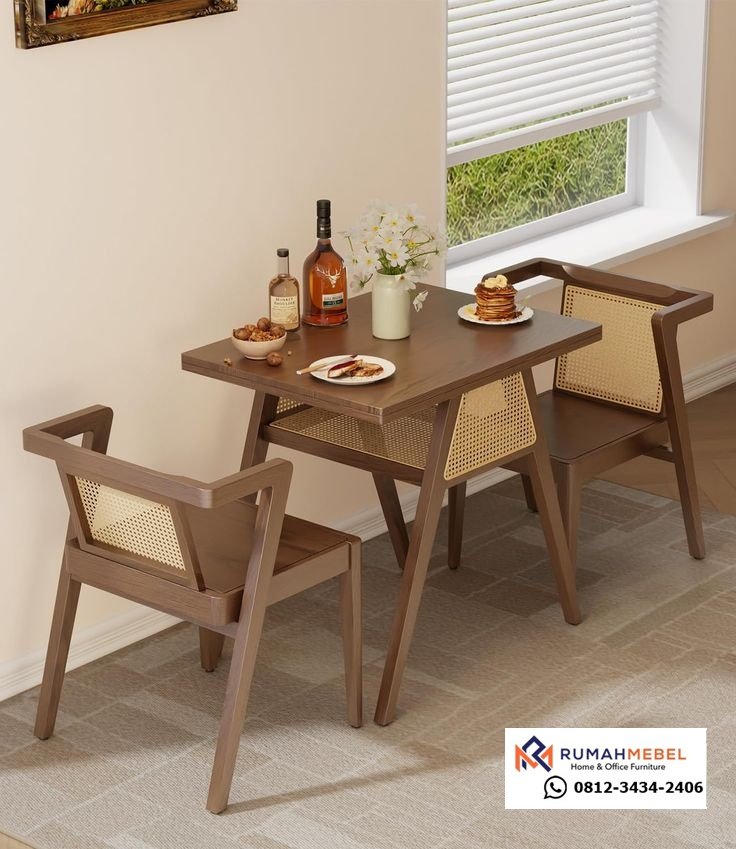 Set ini terdiri dari satu meja persegi minimalis dan dua kursi yang nyaman. Meja yang ringkas memiliki rak penyimpanan rotan di bagian bawah, memudahkan Anda menyimpan majalah, serbet, atau dekorasi tanpa memakan ruang di atas meja. Sementara itu, kursi dengan sandaran rotan yang ergonomis memberikan sirkulasi udara optimal dan kenyamanan saat Anda menikmati hidangan. Finishing kayu berwarna walnut yang elegan memancarkan suasana hangat dan tenang, menciptakan sudut makan yang intim dan nyaman di mana pun Anda meletakkannya. RUMAHMEBEL memastikan setiap produk diproduksi dengan detail terbaik untuk meningkatkan kualitas hidup Anda.