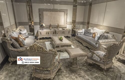 Set Terbaru Sofa Mewah Klasik Ukir Jepara sebuah furnitur ruang tamu yang menonjolkan kehalusan ukiran tangan, desain elegan, dan bahan berkualitas tinggi, Bentuk sofa ini terinspirasi dari gaya klasik Eropa, menghadirkan nuansa mewah dan berkelas pada ruangan. Desain ukiran yang detail dan dibuat secara manual oleh pengrajin Jepara yang terampil, memberikan nilai seni tinggi dan kesan mewah pada sofa. Bahan pembuatan rangka menggunakan Kayu Berkualitas tinggi pilihan seperti kayu jati solid Gred A yang sudah melalui proses pengeringan (oven) untuk menjamin kokoh, kuat, dan awet pada sofa. Sofa ini Menggunakan busa jenis LJ 26 yang dikenal empuk dan kenyal, memberikan kenyamanan saat digunakan, selain itu sofa di lapisi kain premium serta kain pembungus berkualitas terbaik seperti oscar atau kain beludru halus, Keberadaan set sofa ini dapat secara signifikan meningkatkan tampilan estetika ruangan, memberikan kesan mewah dan indah.