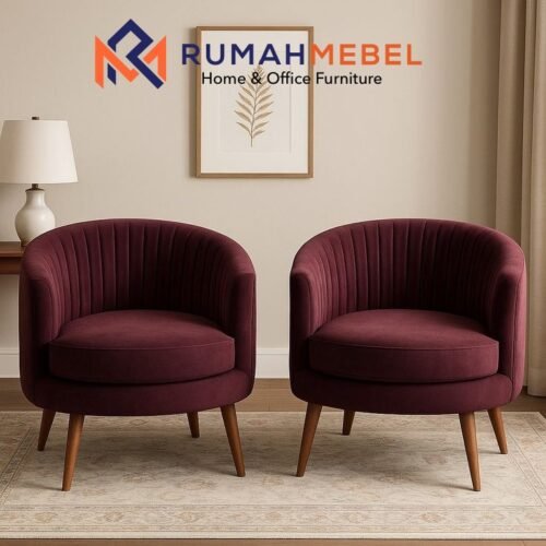 RUMAHMEBEL Furniture dengan bangga menghadirkan sepasang Kursi Accent Beludru yang menciptakan titik fokus mewah di ruang tamu atau kamar tidur Anda. Pertama-tama, kami secara cermat melapisi seluruh kursi dengan kain beludru (velvet) berkualitas tinggi berwarna merah maroon atau ungu tua yang kaya, memberikan tekstur lembut dan tampilan yang sangat elegan. Selain itu, sandaran kursi menampilkan pola jahitan vertikal (fluted/channel tufting) yang detail, menambah sentuhan kemewahan klasik.