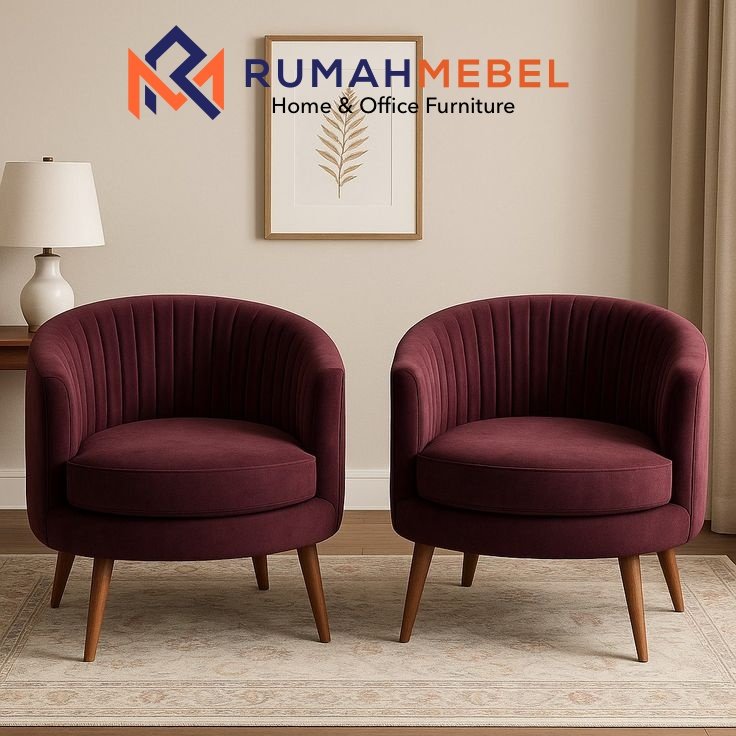 RUMAHMEBEL Furniture menawarkan sepasang Kursi Accent Beludru dengan desain barrel modern yang elegan. Kursi ini dilapisi kain beludru berwarna maroon atau ungu tua yang kaya, dilengkapi detail jahitan vertikal pada sandaran, yang secara instan menambahkan sentuhan kemewahan dan tekstur pada ruangan. Ditopang oleh kaki kayu runcing ala Mid-Century Modern, kursi ini tidak hanya menjanjikan kenyamanan, tetapi juga berfungsi sebagai elemen dekoratif yang kuat untuk melengkapi ruang tamu, ruang keluarga, atau sudut baca Anda.