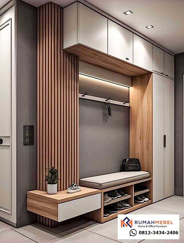 Kabinet built-in multifungsi 3-in-1 untuk area foyer atau mudroom. Menyediakan penyimpanan tertutup, rak sepatu terbuka, area duduk, dan gantungan jaket. Dirancang dengan gaya minimalis modern, aksen kayu, dan pencahayaan estetik dari RUMAHMEBEL.